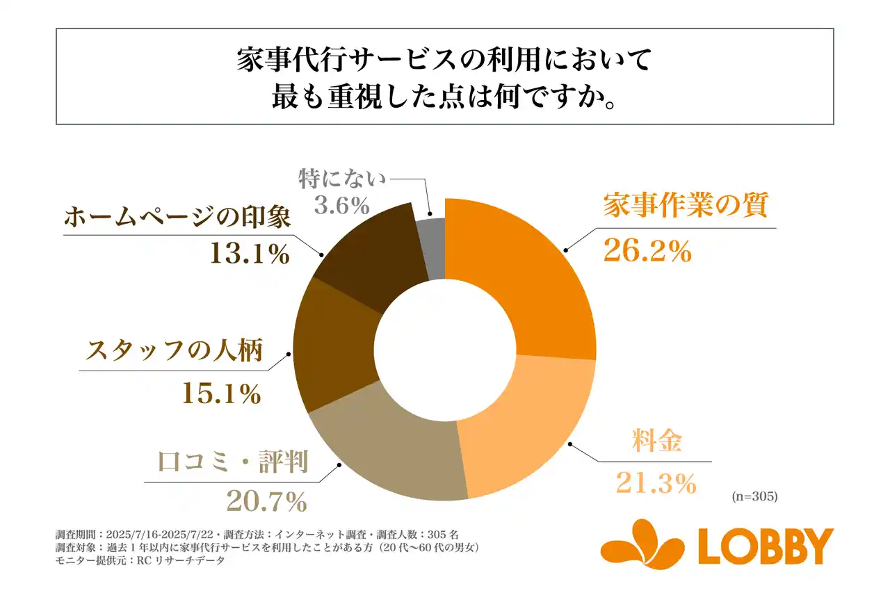 また、「家事代行サービスの利用において最も重視した点」を尋ねる設問への回答では、1位が「家事作業の質」で26.2%、2位が「料金」で21.3%、3位が「口コミ・評判」で20.7%という結果になりました。この結果から、家事代行サービスの利用において最も重視した点は、「家事作業の質」であることが明らかになりました。 |