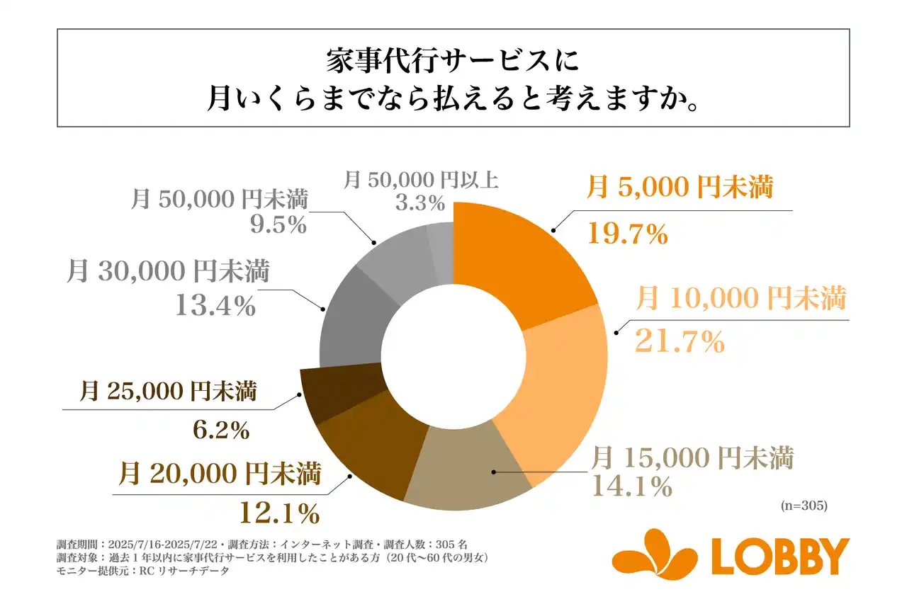 調査の最後、「家事代行サービスに月いくらまでなら払えるか」を尋ねる設問への回答では、1位が「月10,000円未満」で21.7%、2位が「月5,000円未満」で19.7%、3位が「月15,000円未満」で14.1%という結果になりました。本調査結果を見ると、月10,000円未満という層が約4割いる一方、月20,000円以上という層も3割以上いることから、家事代行サービスに月に払える金額は人によって様々であることが明らかになりました。 |