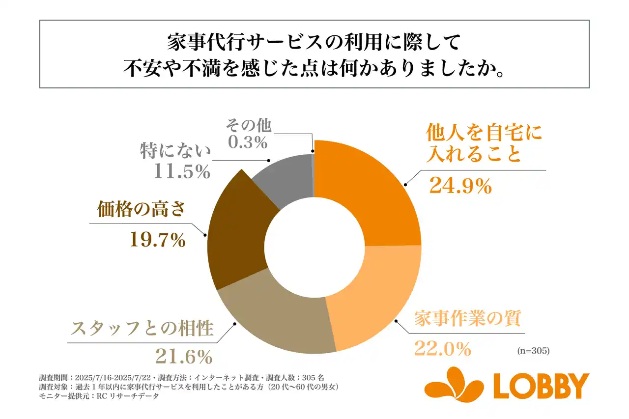 次に、「家事代行サービスの利用に際して不安や不満を感じた点」を尋ねる設問への回答では、1位が「他人を自宅に入れること」で24.9%、2位が「家事作業の質」で22.0%、3位が「スタッフとの相性」で21.6%という結果になりました。この結果から、家事代行サービスの利用の際に主に不安や不満を感じた点は、「他人を自宅に入れること」や「家事作業の質」であることがわかりました。 |