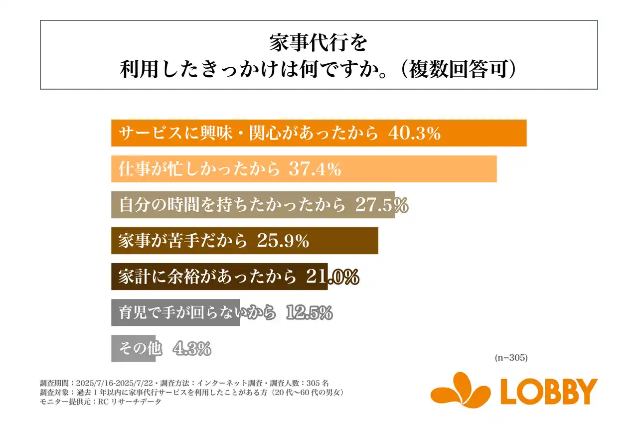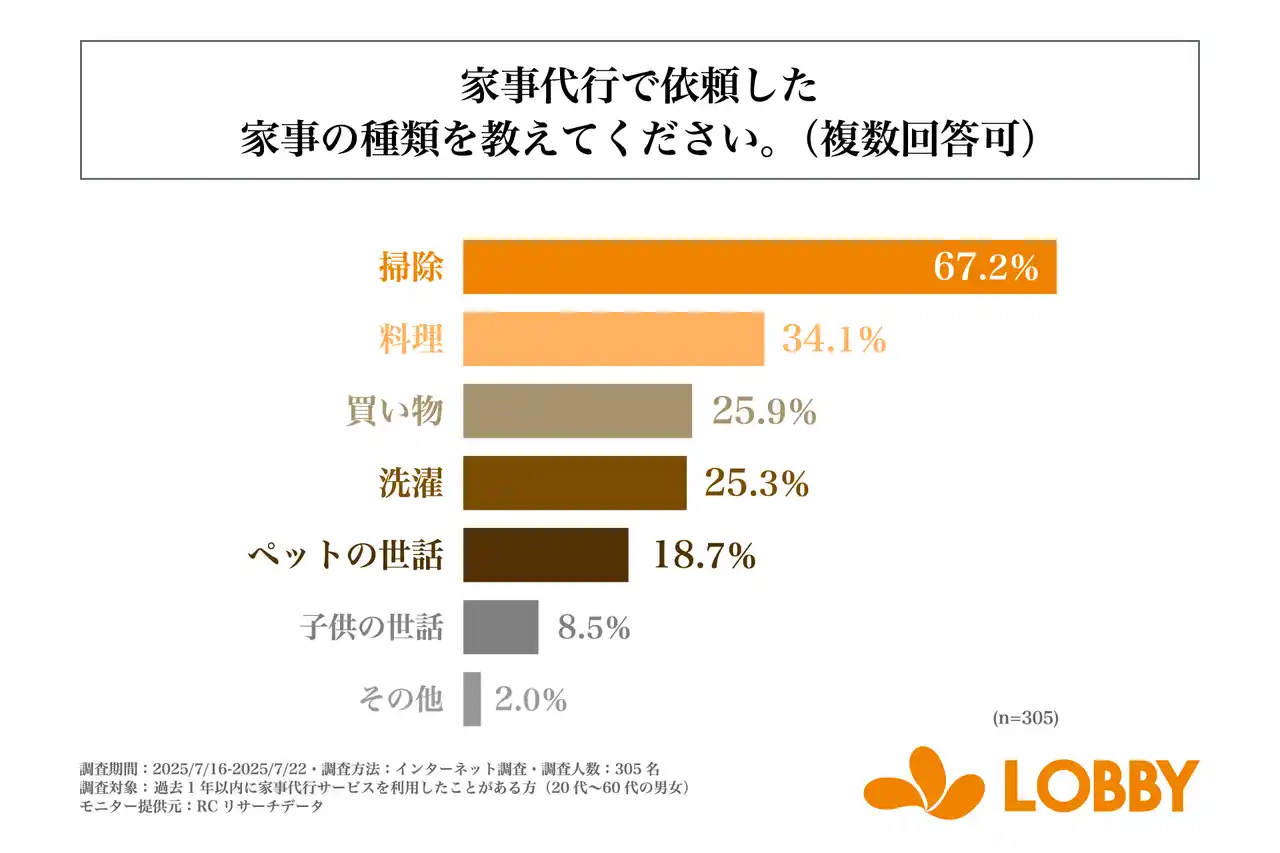 株式会社ロビー(本社:東京都新宿区、代表取締役:対馬 誉仁)が運営する「LOBBY」は、は、過去1年以内に家事代行サービスを利用したことがある方(20代~60代の男女)を対象に「家事代行サービスの利用実態」に関する調査を実施しました。この調査から、家事代行の利用頻度や利用したきっかけ、代行してもらっている家事の種類などが明らかになりました。