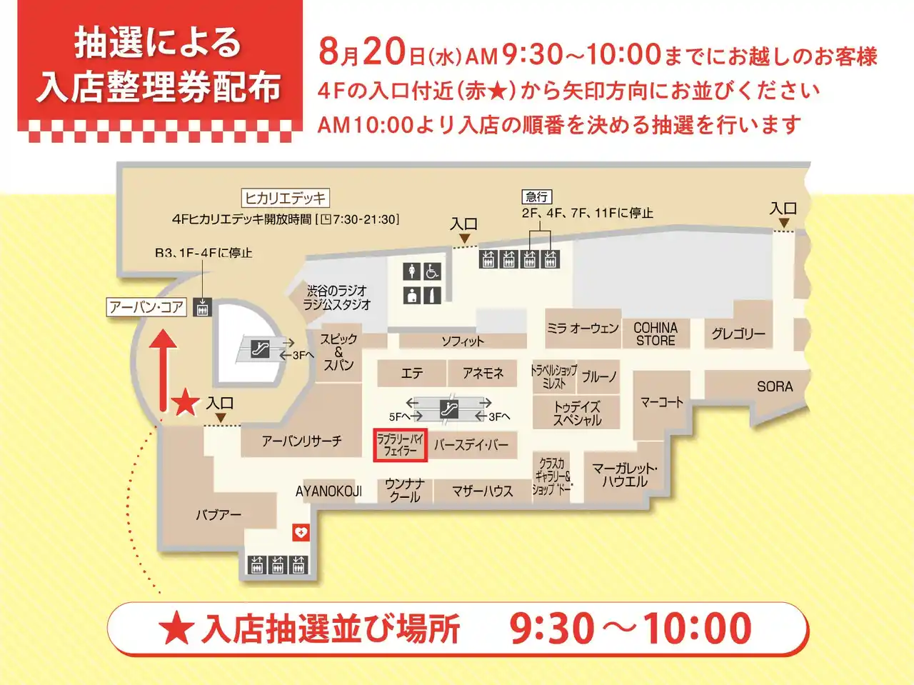 入店抽選をご希望のお客様は、8月20日(水)9:30~10:00の間に、4F入口付近の赤★部分からお並びください。 |