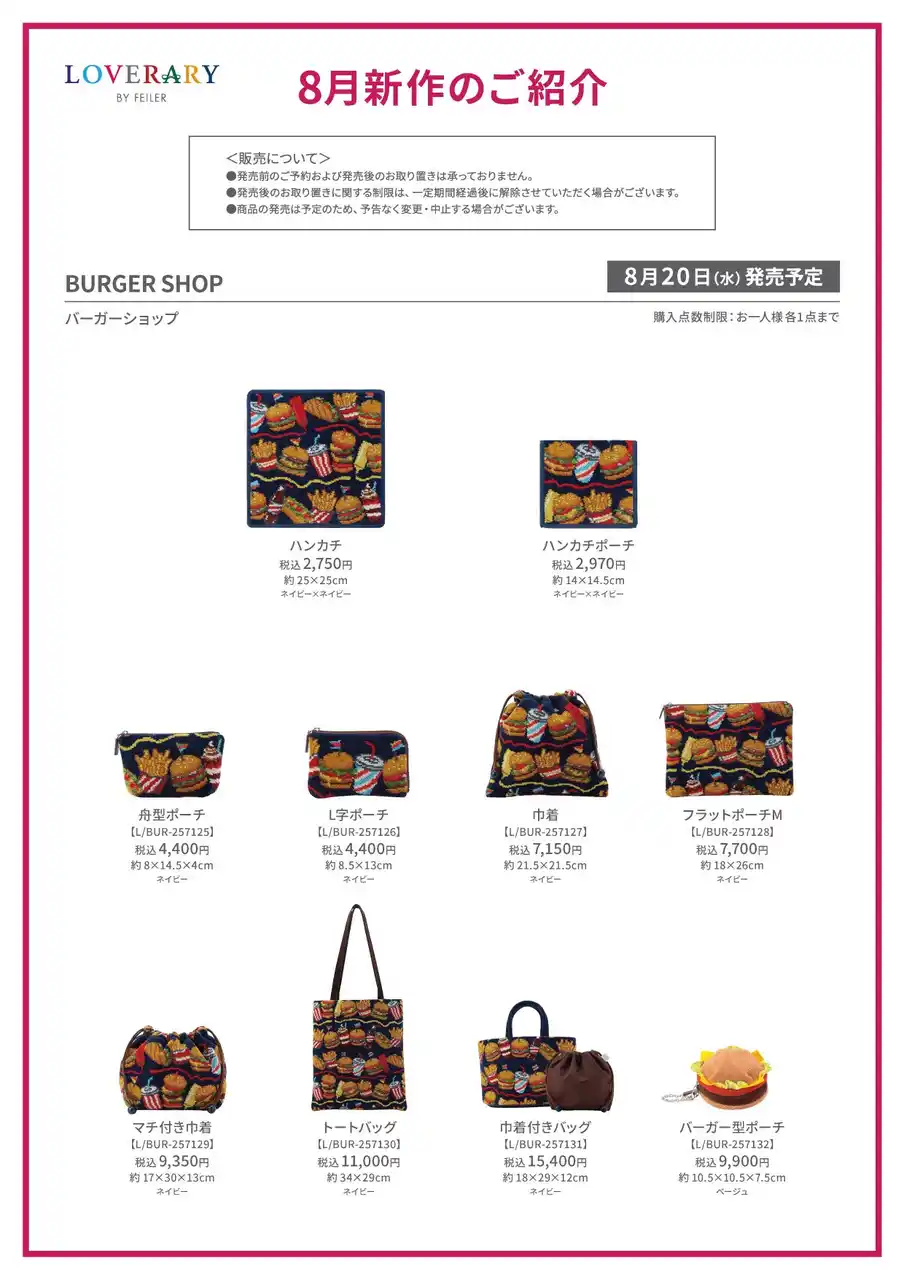 ラブラリー バイ フェイラー渋谷ヒカリエ ShinQs店限定商品の他に、同日ラブラリー バイ フェイラー取扱店舗全店で発売する『バーガーショップ』の商品も販売いたします。販売商品のラインアップは以下をご覧ください。 |