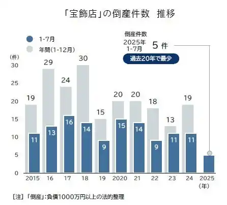 「宝飾店」業界が好調だ。2025年1-7月に発生したジュエリーショップなど「宝飾店」の倒産(負債1000万円以上、法的整理)は5件にとどまり、2024年の同期間(11件)を大きく下回った。このペースが続けば、通年では過去20年間で最少となることが見込まれる。 |