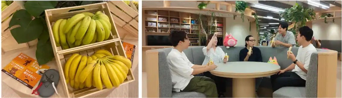 「無限バナナ」は、出社した従業員がいつでも好きなだけバナナを食べることができる福利厚生です。栄養価の高いバナナを栄養補助として提供することで、忙しくて食事が疎かになってしまう従業員の健康促進を図ります。また、バナナは皮があることで直接手を触れずに食べることができ、感染症対策としても有効なため、従業員の健康配慮と感染対策の両立を考えて導入に至りました。 |