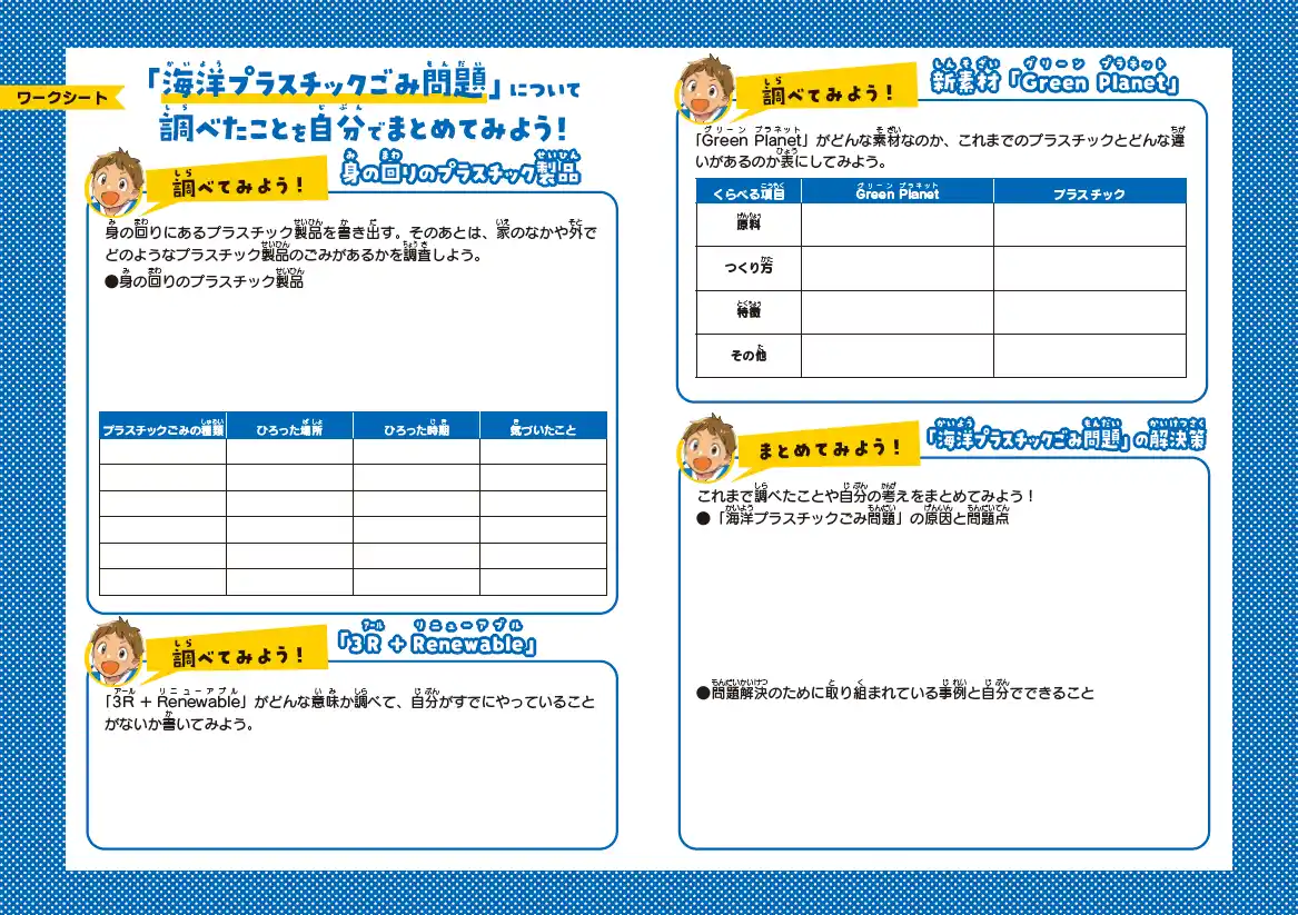 本特集では、海洋問題の中でも特に大きな問題となっているプラスチックごみについて、そして、環境問題のキーワードのひとつである「3R+Renewable」について解説。さらに、サステナブルな環境に配慮したバイオプラスチックの中でも、株式会社カネカの生分解性バイオポリマー「Green Planet(R)」を紹介しています。まとめるのが苦手……という子でも安心のワークシート付きで、必要な情報を迷うことなく調べることができます。単なる調べ学習にとどまらず、問題解決への取り組みを考えられる自由研究となっています。 |