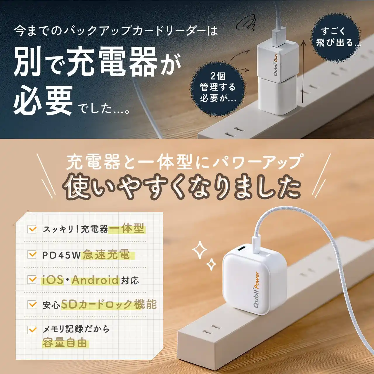 | ●急速充電しながらスマホの写真・動画を自動バックアップできるPD充電器&カードリーダー「Qubii Power」です。 | ||||||||||||