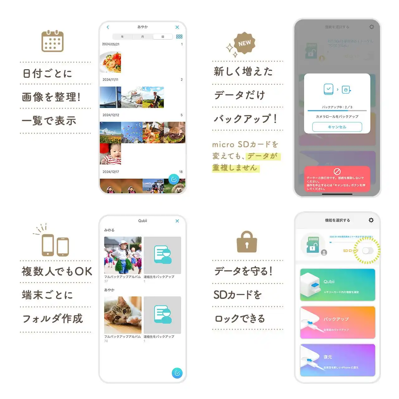 | ●専用アプリ「Qubii Pro」を使用することで、接続するたびに自動でデータをバックアップできます。 | ||||||||||||