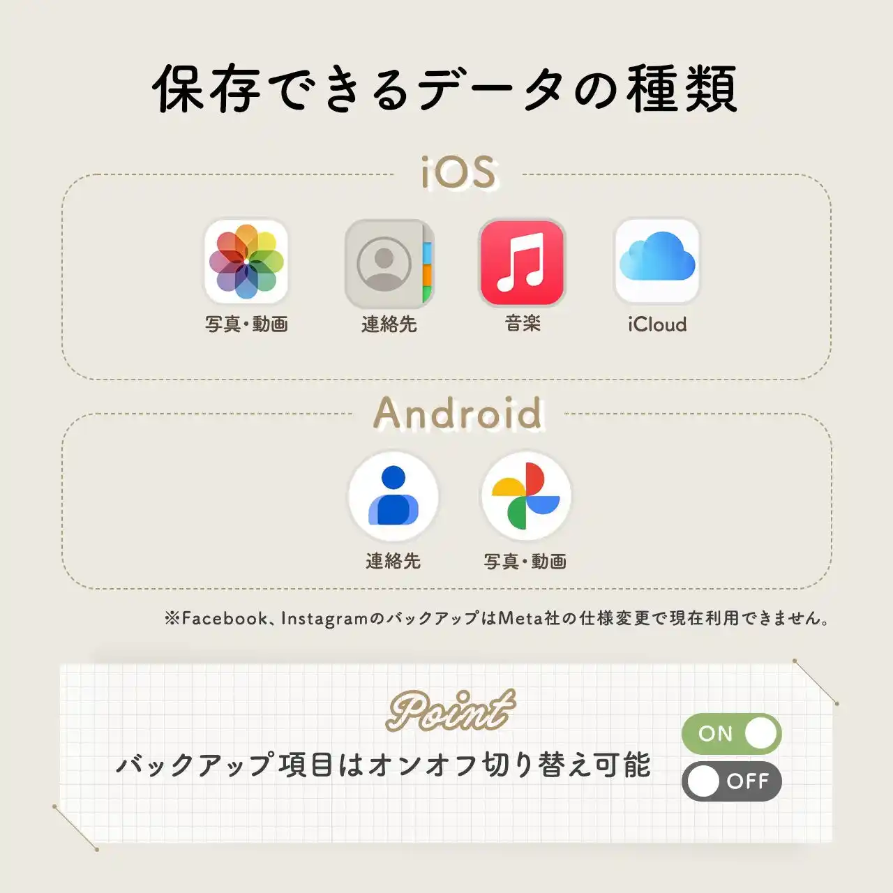 | ※Facebook、InstagramのバックアップはMeta社の仕様変更により現在利用できません。 | ||||||||||||