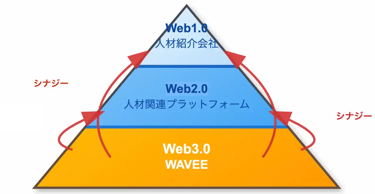 人材業界において、これまでのWeb1.0型の人材紹介モデルおよびWeb2.0型の人材関連プラットフォームモデルに対し、それらを支える"インフラ"、"黒子"として、Web3.0型の仕組みにより、両事業者の方々と協調して、個人・企業にとって最適なマッチングを実現すべく注力しております。 |