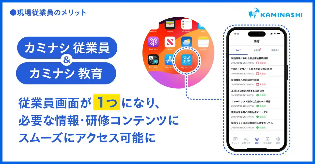 『Myカミナシ』は、現場従業員管理システム『カミナシ 従業員』と動画マニュアル・研修システム『カミナシ 教育』の従業員向け画面を統合したもので、従業員は自身のスマートフォンなど個人のデバイスから業務等に必要な情報や研修コンテンツに一つの画面でアクセスできるようになります。これにより、複数のアプリケーションを使い分ける手間が省け、情報アクセスがスムーズになります。 |