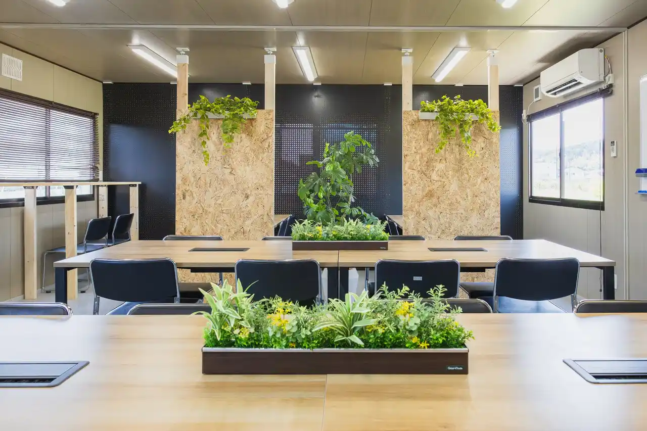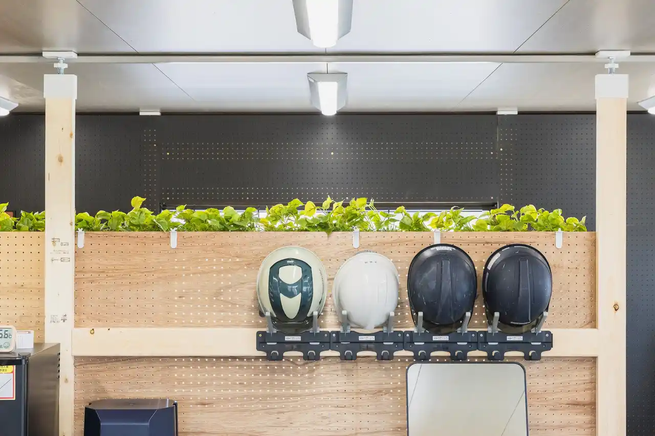 さらに、有孔ボードなどの建設現場でよく使用される素材を内装に活かしている点も特徴です。外仕事で多少汚れても、気兼ねなく使用しやすい環境にすることで、立ち寄りやすく多目的に活用できる場所となっています。また空間の緑視率の高さもポイントで、各所にグリーンを用いることによるリラックス効果も図りました。 |