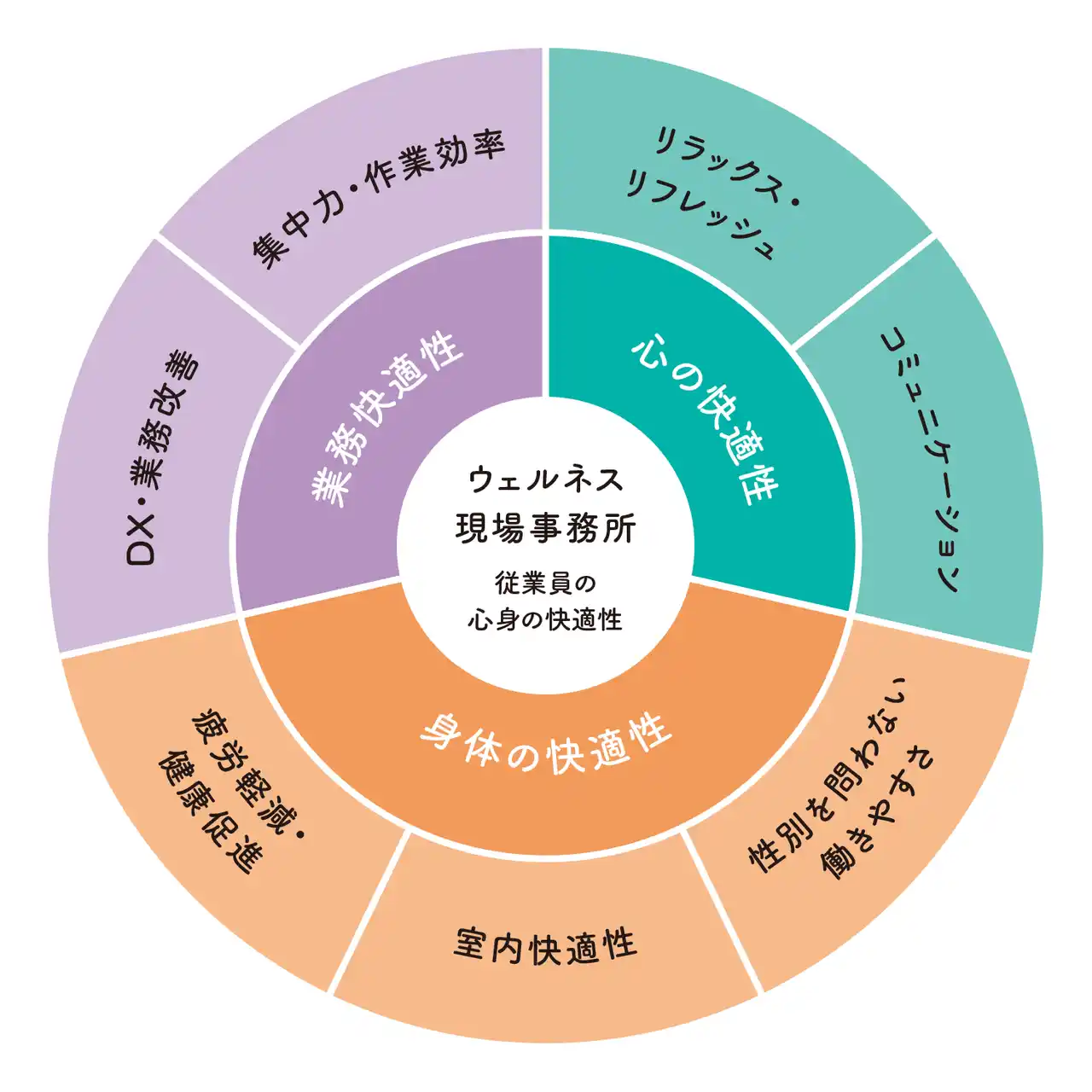 当社の「ウェルネス現場事務所」は、従業員のウェルネス(心身の快適性)を高めることを目的とし、現場事務所を通じて「業務の快適性」「身体の快適性」「心の快適性」という3つの価値を現場で働く従業員に提供することを基本の考え方としています。 |