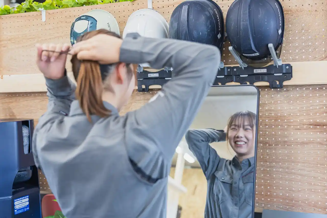壁に設置された有孔ボードにはヘルメットや工具などをひっかけて収納することが可能。現場事務所に欠かせない安全衛生にも配慮し、整理整頓しやすい仕組みを取り入れました。また現場で働く女性の意見から、身だしなみを整える鏡も設置しています。 |