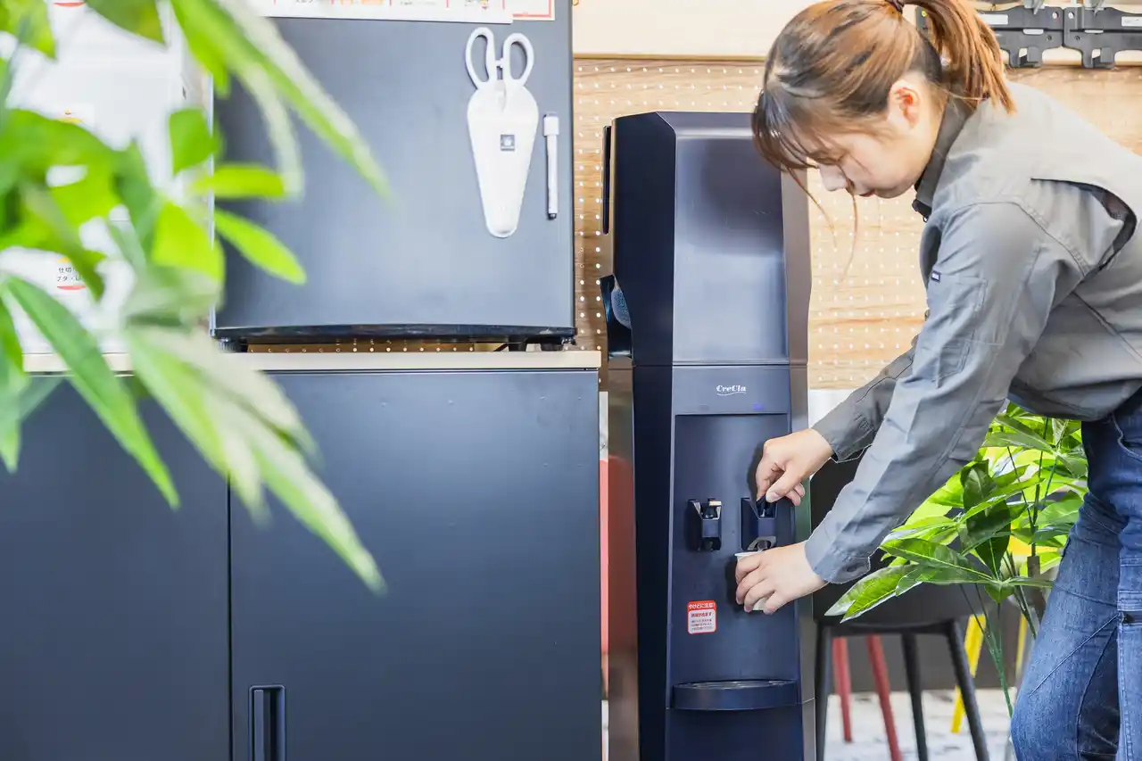 グリーンやアートを取り入れることで、ストレスの軽減やリラックス効果を促進。また、ウォーターサーバーやコーヒーメーカー、100円で自由に利用できる置き型社食を設置し、飲食によるリフレッシュもサポートしています。社食は管理栄養士監修のメニューのものを採用し、従業員の健康にも配慮しています。 |