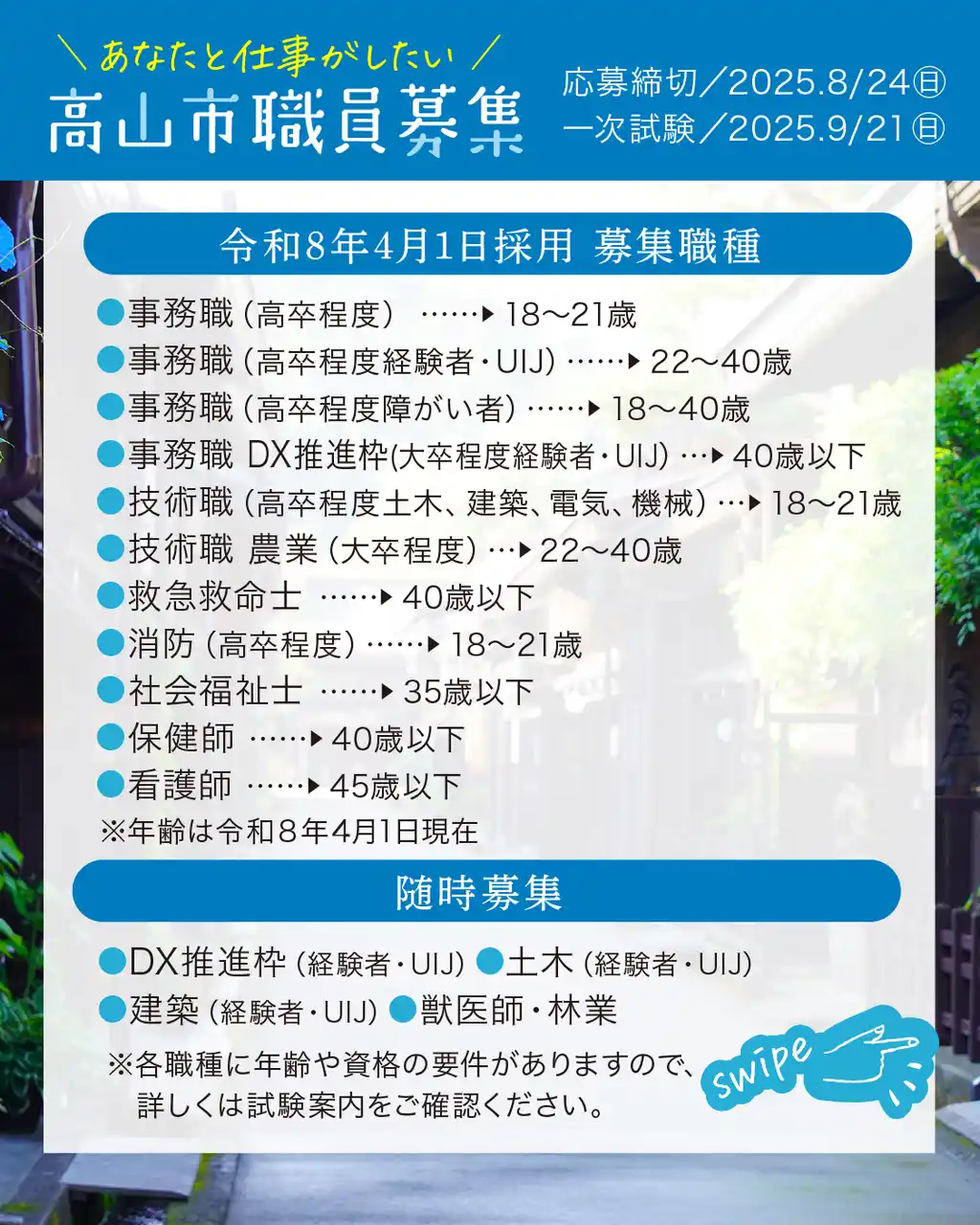 ▶️ 令和8年4月採用 高山市職員採用試験案内はこちら
