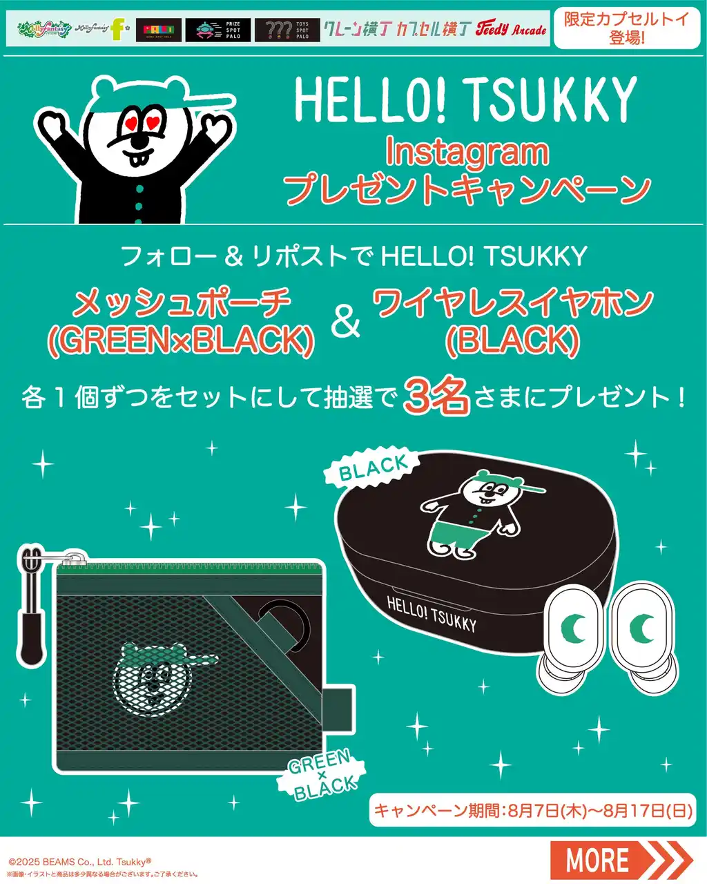 また、限定カプセルトイ用商品の展開を記念し、モーリーファンタジー公式X・Instagram で「HELLO! TSUKKY メッシュポーチ&ワイヤレスイヤホンセット」が当たるプレゼントキャンペーンを開催いたします。 |