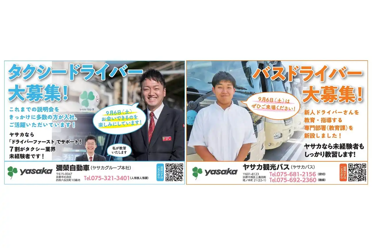 彌榮自動車株式会社(ヤサカグループ本社、以下:彌榮自動車)ならびにヤサカ観光バス株式会社(以下:ヤサカ観光バス)は、2025年9月6日に行われる「第4回 バス・タクシードライバー 就職相談会 in 京都(主催:京都リビング新聞社、協力:京都府タクシー協会・京都府バス協会)」に共同で出展することをお知らせいたします。 |
