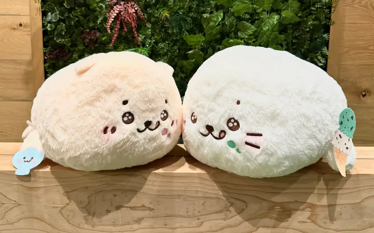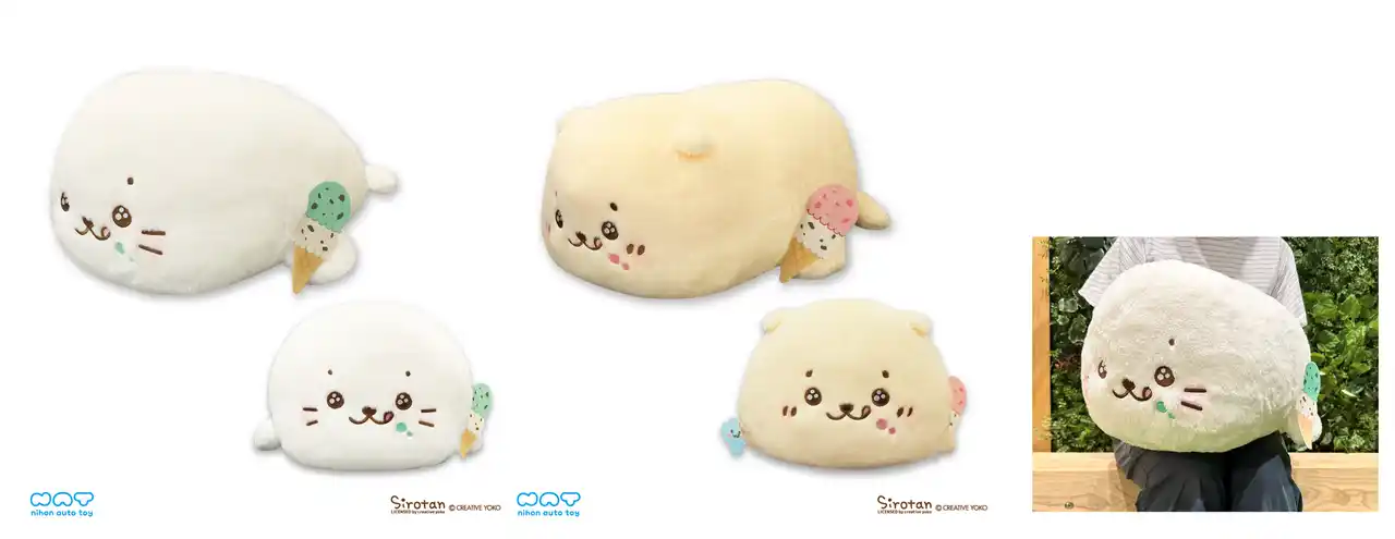 「しろたん」と「らっこいぬ」のメガサイズのぬいぐるみ。もちもちふわふわな触感で、抱き心地抜群です。 |