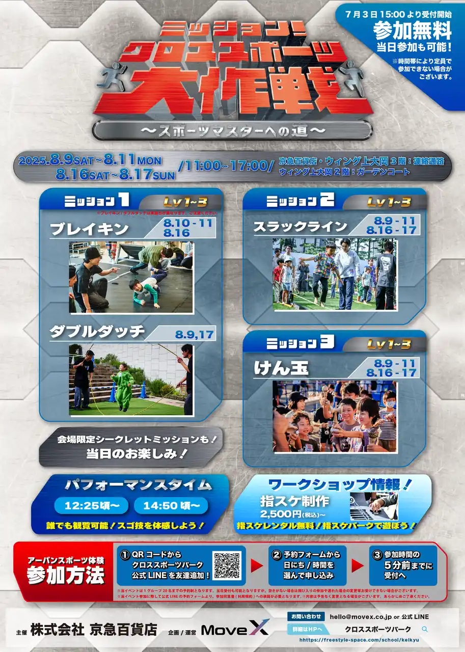 株式会社MoveX(本社:東京都目黒区)は、株式会社京急百貨店と共同で、2025年8月9日(土)より京急百貨店(本社:横浜市港南区)にて、参加無料の体験型スポーツイベント『ミッション!クロススポーツ大作戦~スポーツマスターへの道~』を開催いたします。 |