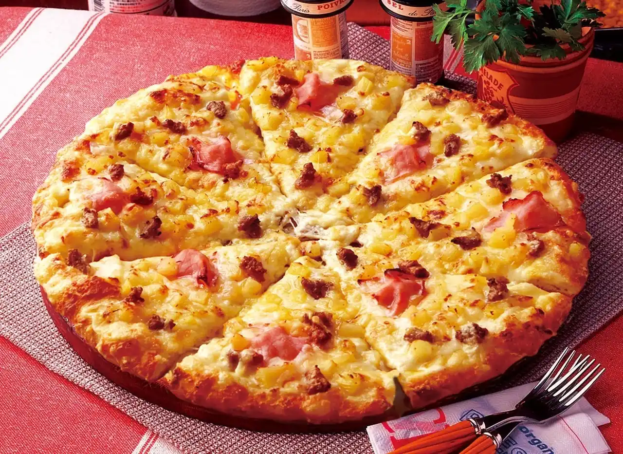 ピザーラ創業当初の1987年から販売しているこのピザは、角切りにカットしたジューシーなパイナップルに、生ハムやイタリア風ソーセージのお肉の旨みと塩味がマッチした一品です。 |