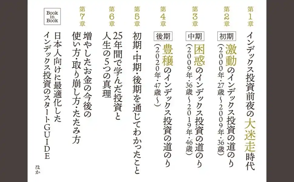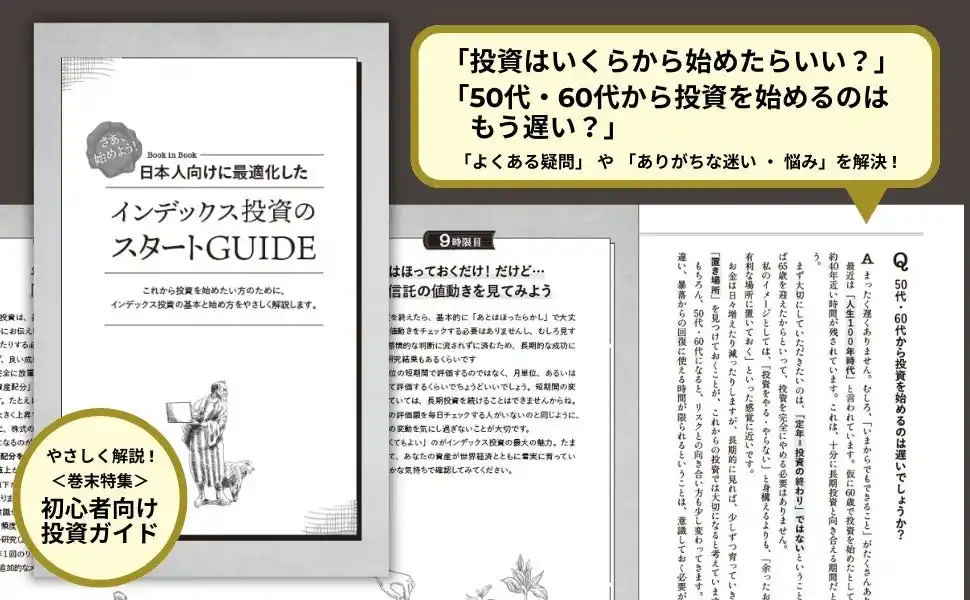 | 巻末に収録した「日本人向けに最適化したインデックス投資のスタートGUIDE」では、これから投資を始める方に向けて、著者のノウハウを凝縮しています。今日から始められる具体的な行動がきっと見つかるはずです。 | |||||||||