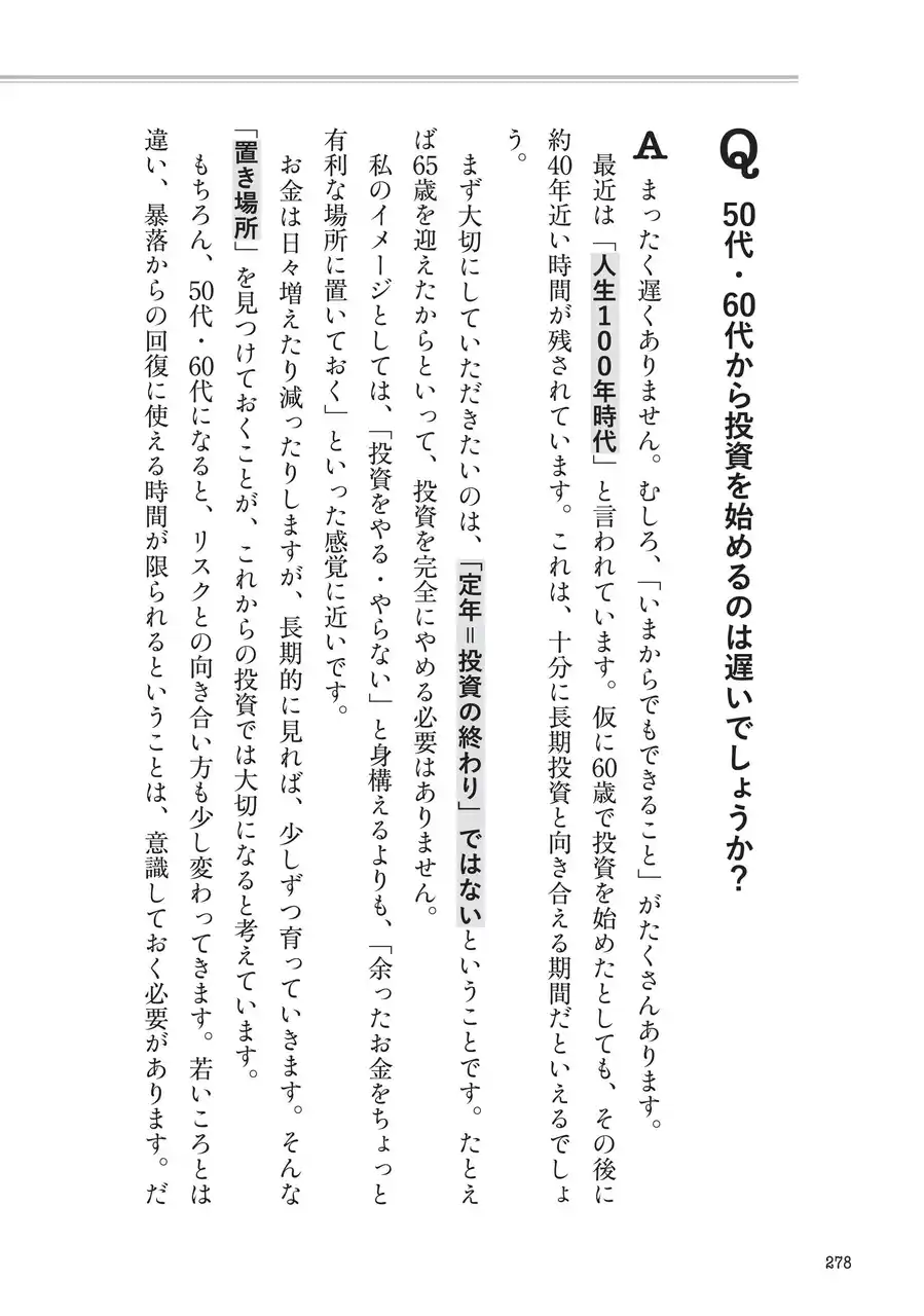 | 「投資はいくらから始めたらいい?」「50代・60代から投資を始めるのは遅いでしょうか?」といった読者からの質問に本音でお答えする。 | |||||||||