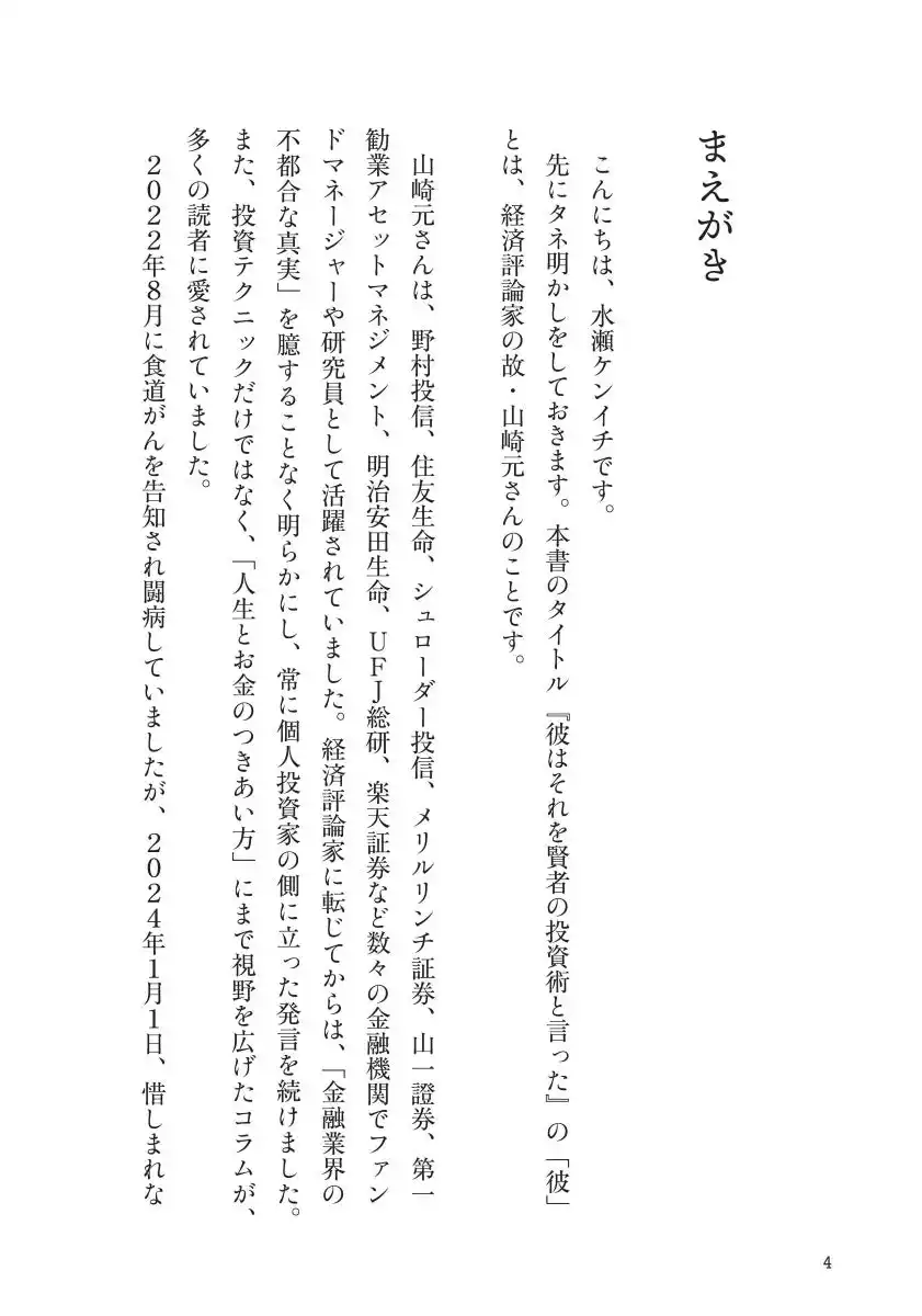 | 故・経済評論家山崎元氏と共著した『ほったらかし投資術』はベストセラーとなり、インデックス投資を世の中に広めた水瀬氏。投資を始めたばかり、また、これから投資を始めようとする方へ、投資をする人生とはどういうものなのか。水瀬ケンイチが、実体験をもとに渾身の力を込めて語ります。 | |||||||||