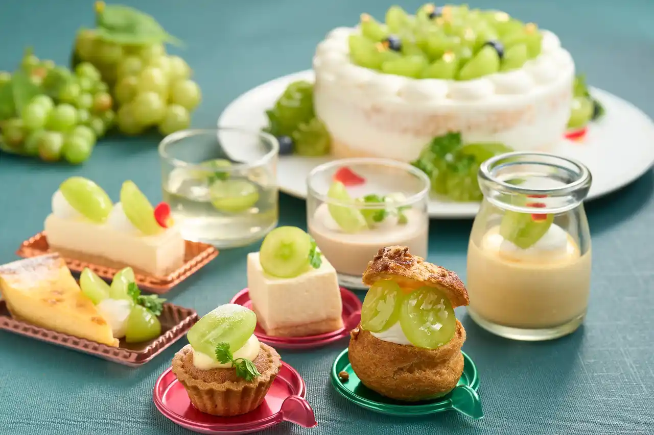 アーモンドを纏わせ香ばしく焼き上げたシューに、香り豊かなアールグレイ風味のカスタードとみずみずしいマスカットを合わせた「シャインマスカットと紅茶のプチシュークリーム」や、なめらかなくちどけのフロマージュブランのムースに、シャインマスカットの爽やかな甘みが口に広がる「シャインマスカット仕立てのムースフロマージュブラン」、その他にも、果実が持つ自然の甘みを繊細に活かしたショートケーキやジュレ、タルトなど、この時期ならではの旬の味わいを存分にご堪能いただける上質なスイーツを取り揃えております。 |