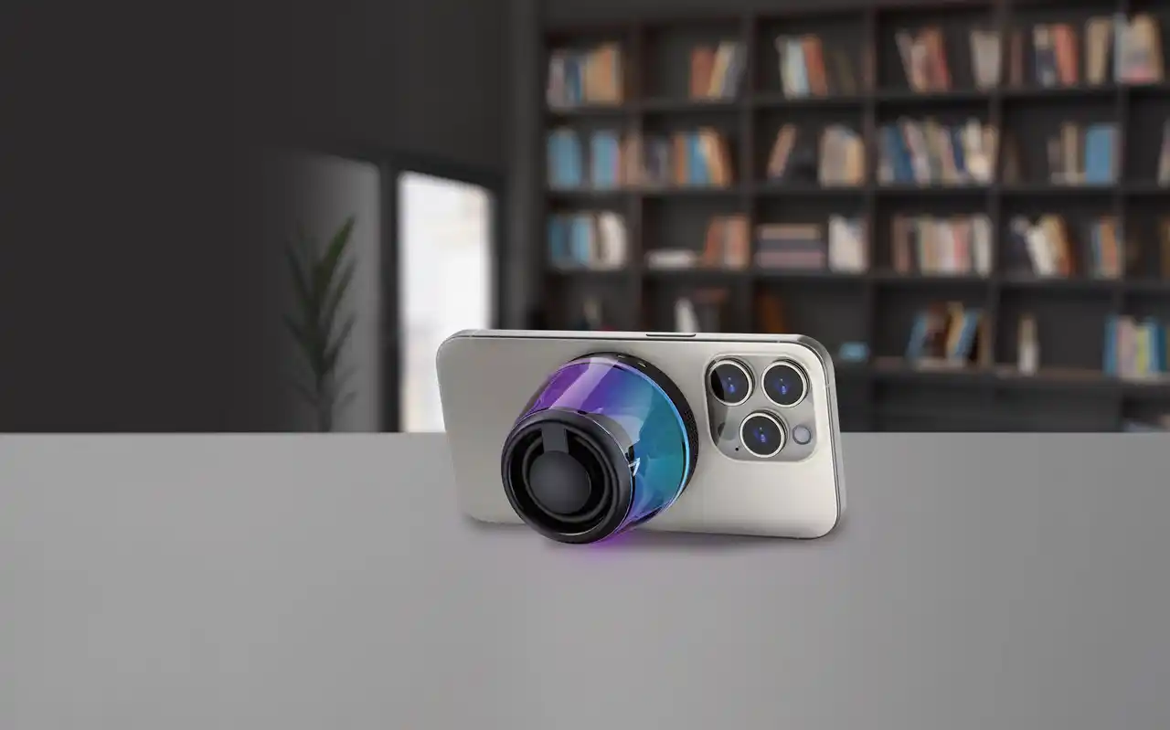 底面にリング型のマグネットを搭載しているため、iPhoneなどのマグネット内蔵機種ならそのまま、マグネット非内蔵のスマホには付属のマグネットリングを貼り付ければ簡単にくっつけられます。スマホの背面に吸着すれば、スマホスタンドしても活躍し、ゲームや動画視聴の際に臨場感あふれる音を手軽に楽しめます。また、冷蔵庫や金属製の棚など、マグネットがくっつく場所であればさまざまな場所に貼りつけることが可能です。 |