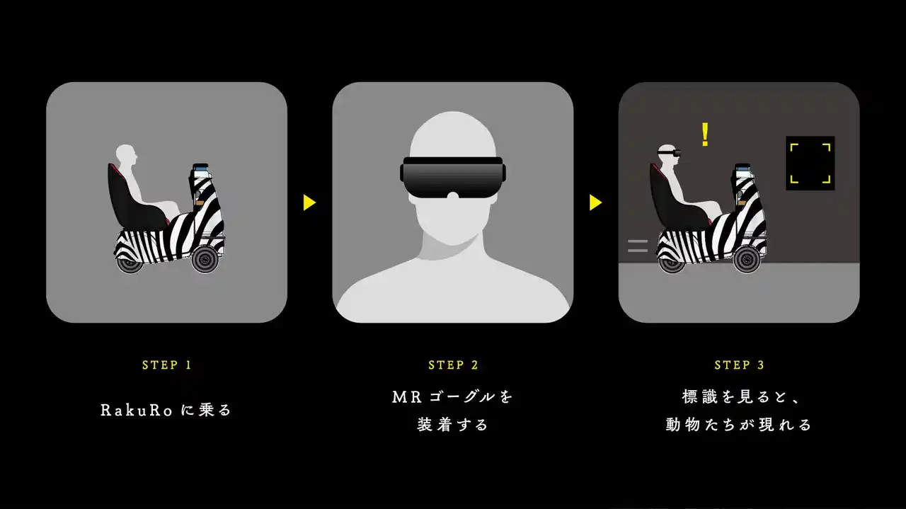 本イベントは「人とロボットの共生」を具現化する夏休みイベントとして、MRゴーグルを装着しながら自動運転の一人乗りモビリティに乗車し、XR技術により再現された動物を間近で観察する近未来型サファリパークです。 |