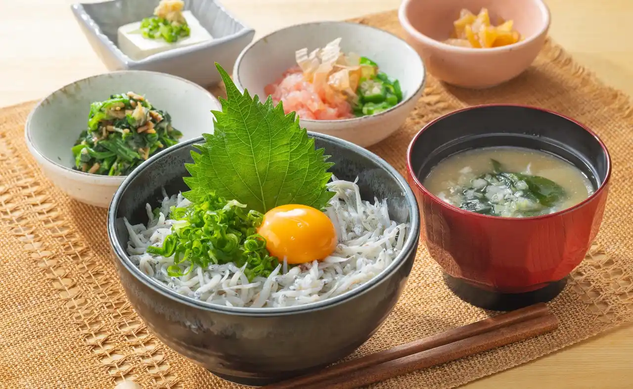 | ふっくらと釜揚げした湘南しらすをたっぷりとのせた丼に、やさしい味わいの小鉢を添えた、心と体にうれしい朝の定食です。湘南の海で水揚げされたしらすは、繊細な味わいとやさしい口あたりが魅力です。ご飯との相性もよく、自然な旨みがふわっと広がります。一日の始まりにやさしく整う朝食はいかがでしょうか? | ||||||||||||