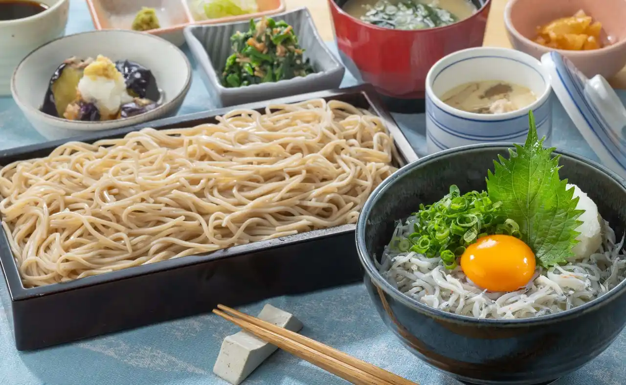 | ふっくらとやわらかく仕上げた釜揚げ湘南しらすを贅沢にのせた丼と、のどごしの良い蕎麦を一膳にまとめたセットです。湘南の海でとれた新鮮なしらすは、素材本来の旨みとほどよい塩気があり、ご飯との相性は抜群です。ひと口ごとに海の恵みを感じられます。季節を問わず、幅広いお客様にお楽しみいただける一膳です。 | ||||||||||||