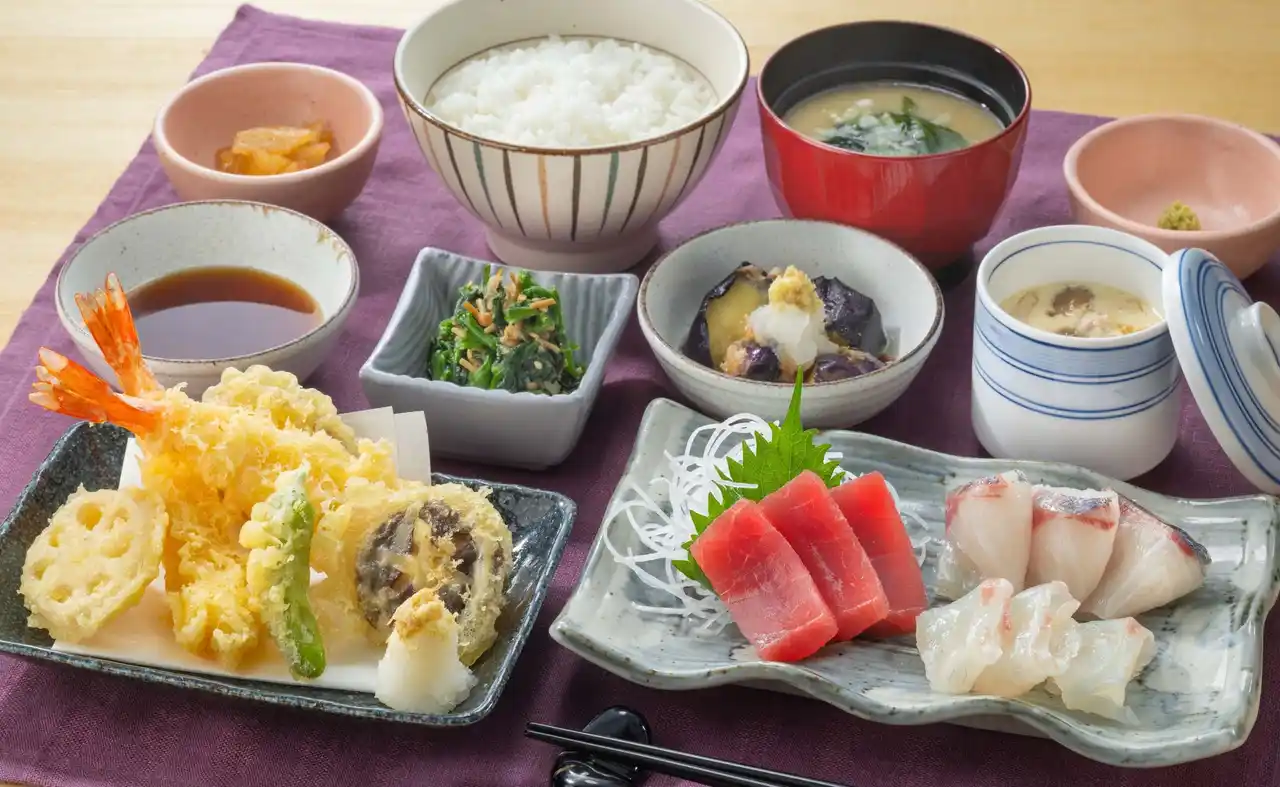 | サクッと揚がった天ぷらに、活〆真鯛、活〆しまあじ、マグロの新鮮なお刺身三点盛りを合わせた、特別な御膳です。こだわりの天ぷらは、ご注文をいただいてから一つひとつ丁寧に揚げることで、素材本来の旨みと香りを引き出しました。天ぷらとお刺身、異なる魅力を一度に楽しめる贅沢な組み合わせは、心もお腹も満たされること間違いなし。 | ||||||||||||