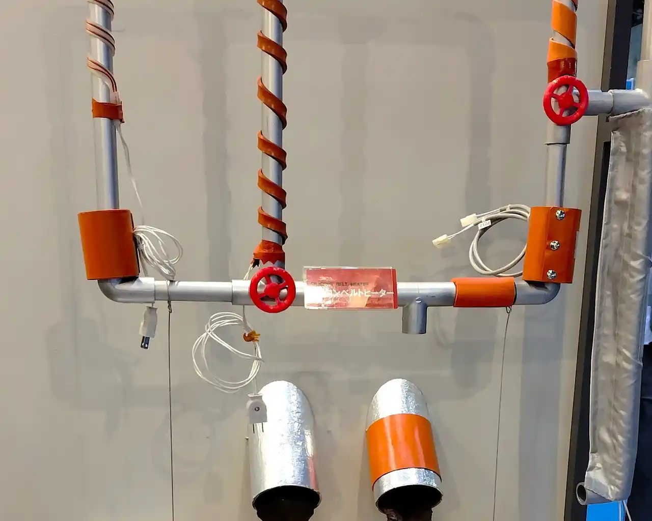 | 台湾市場で注目される日本製産業用ヒーター。スリーハイ納品先の約2割は半導体業界。配管やバルブの温度低下を防ぎ、省エネ・作業安全性を向上させるメイド・イン・ジャパンヒーターを台湾企業と共同出展で紹介。 |