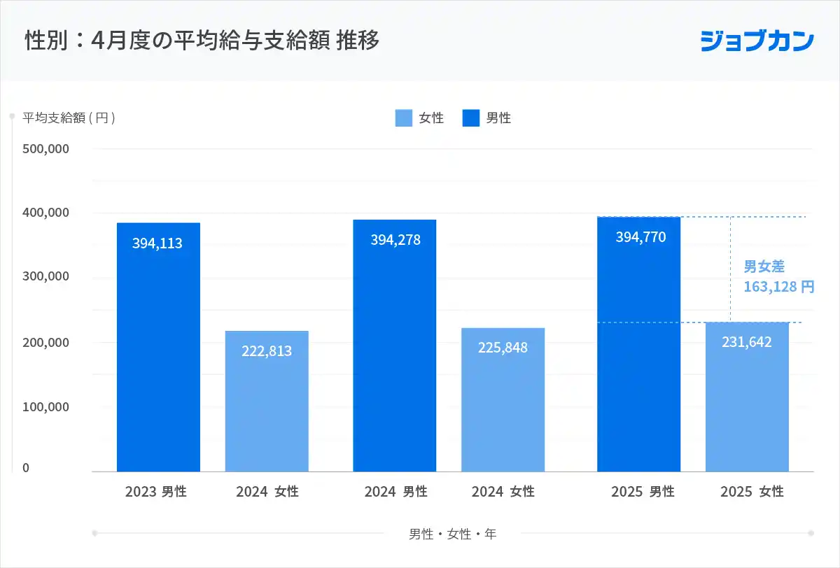 全体の賃上げ基調とは裏腹に、男女間の賃金格差は依然として大きな課題です。2025年4月度の男性の平均給与支給額394,770円に対し女性は231,642円と、その差は163,128円にのぼります。 |