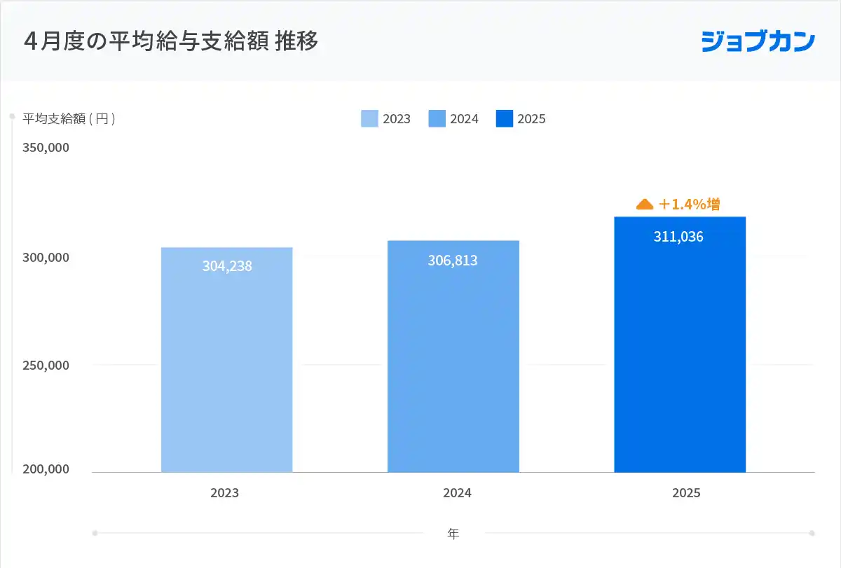 2025年4月度の平均給与支給額は311,036円となり、前年同月比で4,223円(+1.4%)増加しました。 |