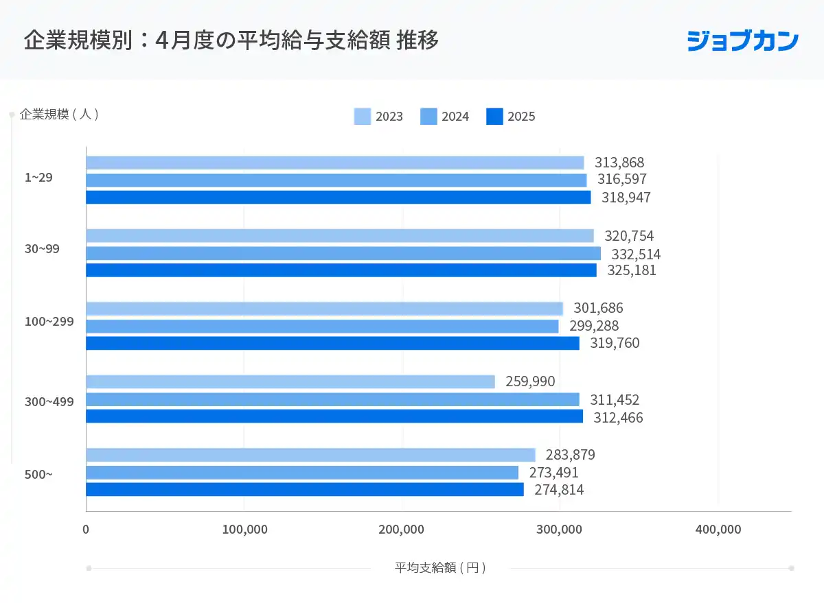 また、企業規模別では100~299名規模の企業で前年比+6%強の給与が突出して増加するなど、賃上げ動向の二極化も鮮明になりました。 |