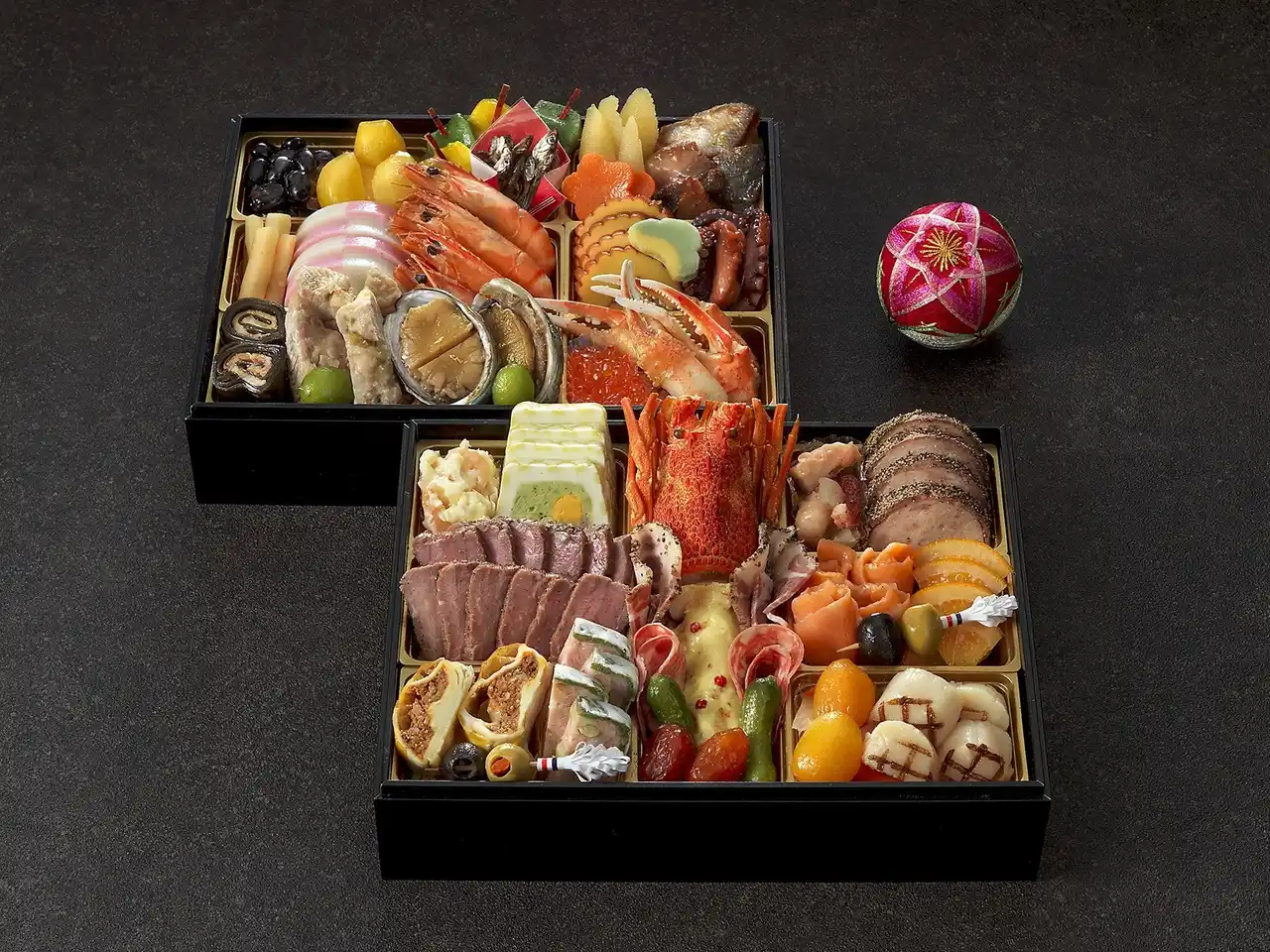 リーガロイヤルホテルグループ統括総料理長 太田 昌利 監修の洋風おせち料理。伊勢海老やキャビア、ウニの料理を詰めた「海の幸」と、黒毛和牛フィレ肉や知床どりなどを贅沢に使用した「山の幸」の二段重です。 |