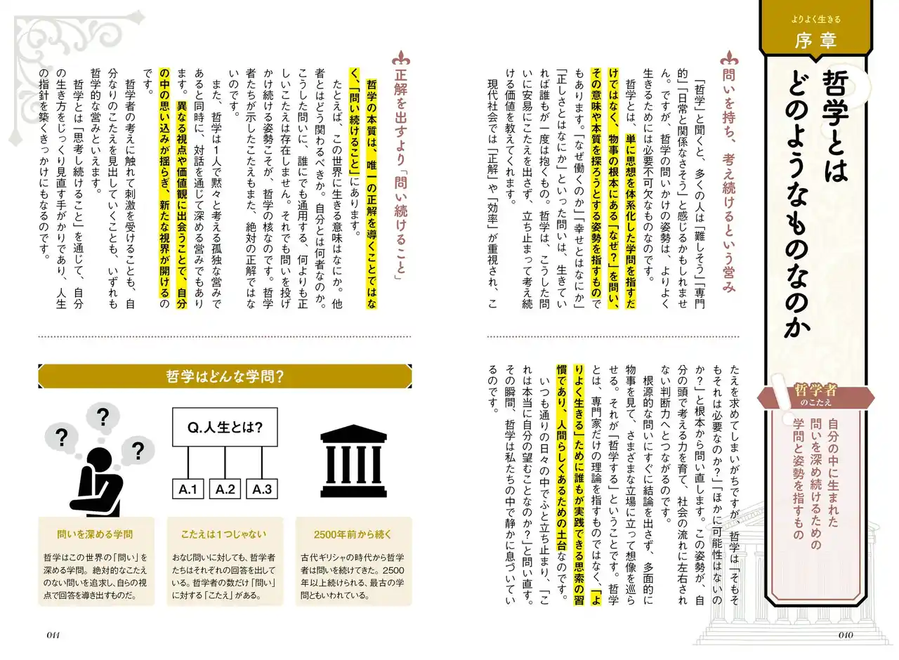 一つは、日常生活の素朴な疑問から「問い」を持ち、考え続ける姿勢そのものが哲学であるということです。常識や前提を疑い、簡単には正解が出ない問いと向き合い続けるプロセスが重視されます。 |