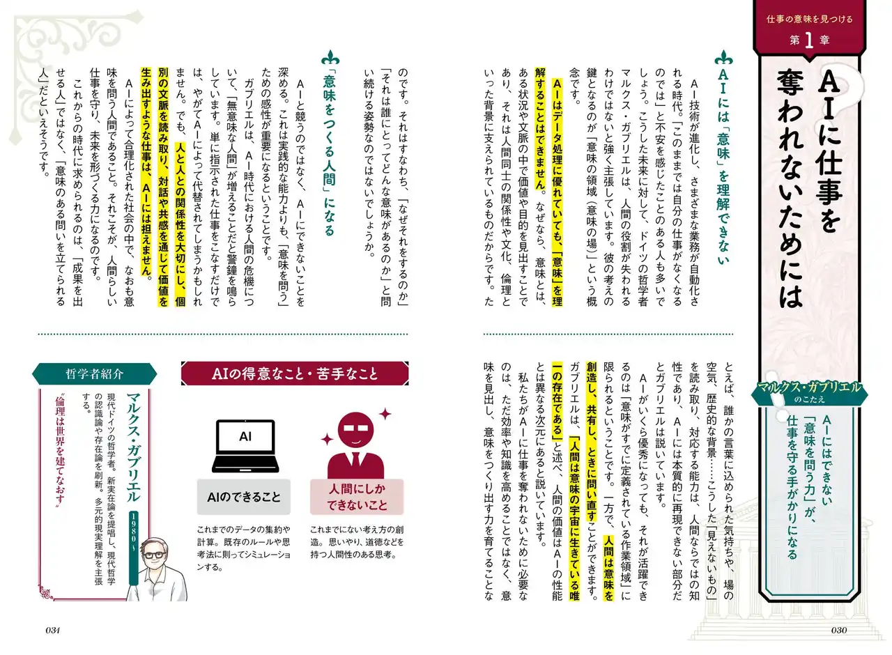 本書は、古今の哲学者たちの思想をビジネスパーソンに向けて再構成し、仕事の課題から人間関係、心の健康、お金の問題まで、様々な悩みに解決の糸口を示します。不確実性の高まる今、必読の書です。 |