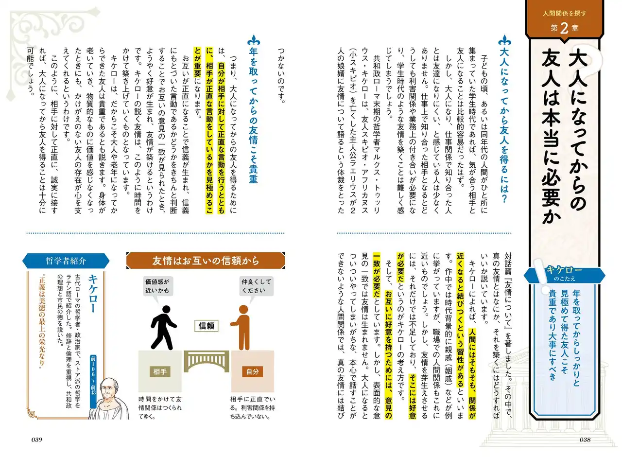 大人になると、学生時代とは異なり利害関係が絡むため、真の友情を築くのは難しくなります。しかしキケローは、そうした時代だからこそ友情は貴重だと説きます。 |
