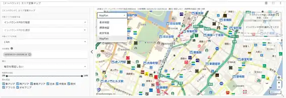 「エリア密集マップ」では、地図の種類も選ぶことができますが、プルダウンメニューから「MapFan」を選ぶと、大手店舗のロゴまで表示されます。 |