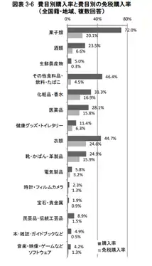 費目別の構成比は宿泊費が1位(33.6%)ですが、ついで買物代(29.5%)、飲食費(21.5%)。金額にすると2兆3,900億円程度になるわけですから、これは大きな額です。ちなみに購入した費目の率では「菓子類」(72.0%)、「その他食料品・たばこ」(46.4%)、「衣類」(44.7%)の順となっています。 |