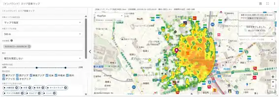 世界42億台以上のスマートフォンから取得された位置情報データを基に、訪日前の居住国を判定。その上で、国内の訪日外国人が利用するスマートフォンから特定エリアにおけるGPSが発信された位置情報を可視化し、エリアごとの“人流の密集度”を明らかにしています。 |