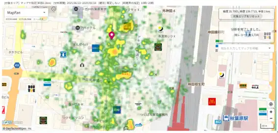 一方で電気街、さらにアニメ・マンガなどの聖地としても訪日外国人に知られる秋葉原。こちらも半径1kmの広域で分析をかけると、駅周辺や秋葉原電気街を中心に日中はかなりの密集が見られます。 |