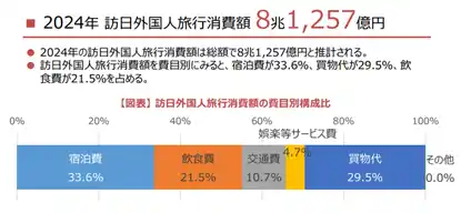 国土交通省・観光庁がまとめた「訪日外国人の消費動向」によると、2024年の訪日外国人による旅行消費額は8兆1,257億円で初めて8兆円を超え過去最高を記録。前年比で53.4%増、コロナ禍前の2019年比でも69.1%増と大幅な伸びとなりました。 |