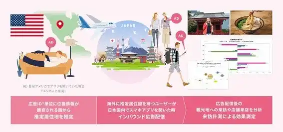 「インバウンドアナリティクス+」では、可視化・分析した訪日外国人のデータを活用し、該当する旅行者のスマートフォンに対して直接広告を配信することが可能です。訪日外国人が日本国内でスマホアプリを開いた際に広告を配信し、広告配信後の観光地来訪や店舗来店を分析することで、「見える」から「届ける」までを一貫して実現します。 |