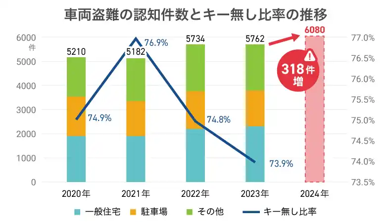 近年、ゲームボーイやCANインベーダーなど電子的な盗難手口による車両盗難が急増。警察庁によれば、2024年の自動車盗難認知件数は6,080件、その7割超が施錠中の車両を狙った犯行です。犯行は組織的かつ高速化が進み、最短1分で盗まれるケースも報告されています。 |