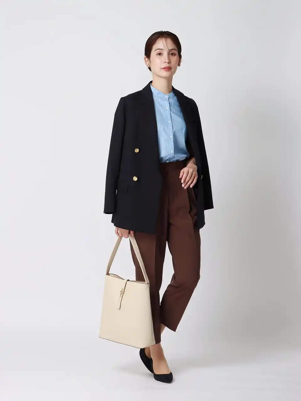 右:オーソドックスな紺ブレスタイルに秋色パンツで季節感を先取り。 |