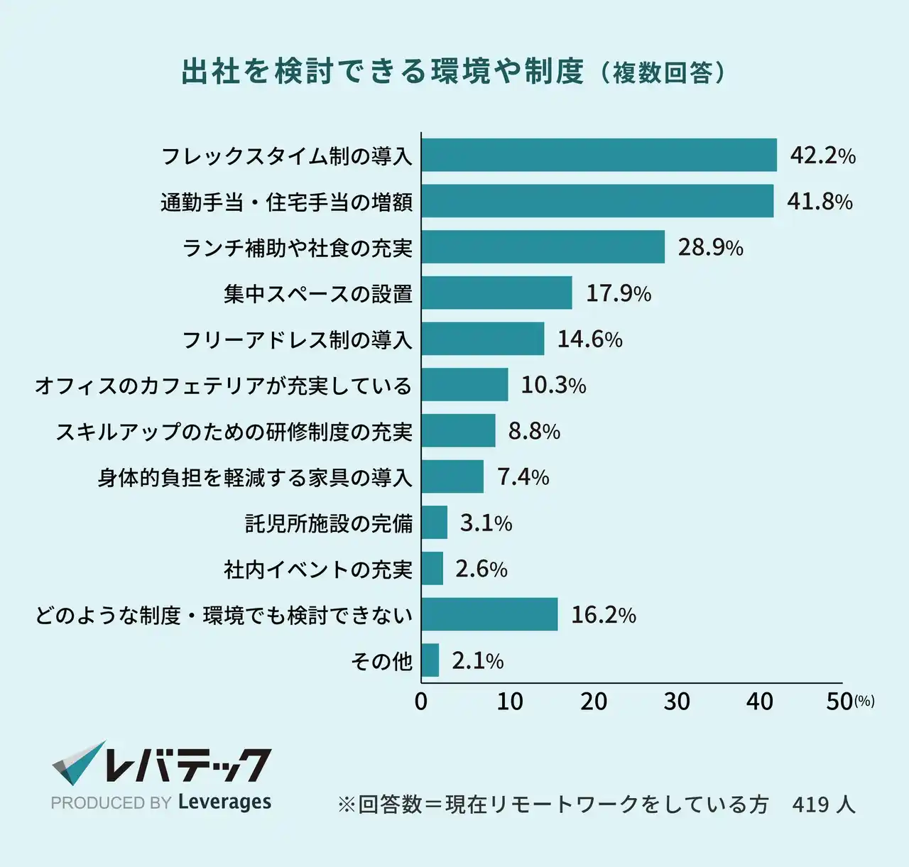 もしフル出社に切り替わった場合に出社を検討できるような環境や制度については「フレックスタイム制の導入(42.2%)」が最も多く、「通勤手当・住宅手当の増額(41.8%)」「ランチ補助や社食の充実(28.9%)」が続きます。一方で約6人に1人は「どのような制度・環境でも検討できない(16.2%)」と回答し、リモートワークへの強いこだわりが改めて浮き彫りになりました。 |
